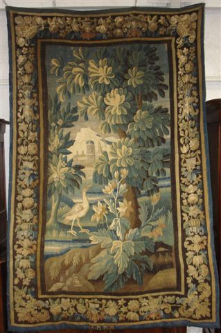 Verdure à l'échassier sur fond d'architecture. Bordure de fleurs sur fond noir, ornée aux angles supérieurs de couronnes ouvertes et de panaches.
