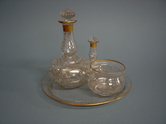 SERVICE VERRE D'EAU en cristal quatre pièces comprenant deux carafes, un sucrier et un plateau circulaire. Décor doré d'un semis d'étoiles et de filets.