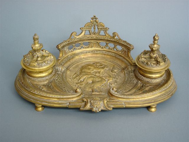 ENCRIER en bronze ciselé, orné d'un homme à demi nu accoudé sur sa lyre et entouré d'oiseaux, dans un médaillon central. Les encriers sont surmontés de vases antiques drapés sur trépieds. Ornementation de frises d'oves, feuillages, guirlandes ajourées et mascaron.
