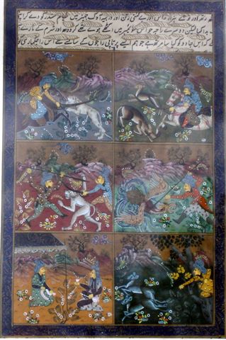 Gouache sur papier. Six vignettes polychromes représentant des chasseurs et des animaux, dans le goût persan, sur fond or. Bordure sur fond bleu. Rehauts or et argent.
