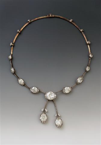 COLLIER articulé en or composé de seize motifs sertis de diamants de taille ancienne en chute, reliés par des lignes de diamants taillés en roses. Il supporte, au centre, deux pampilles ornées de diamants taillés en rose retenant chacune aux extrémités un diamant de taille ancienne sous deux diamants poires. Certains motifs amovibles.