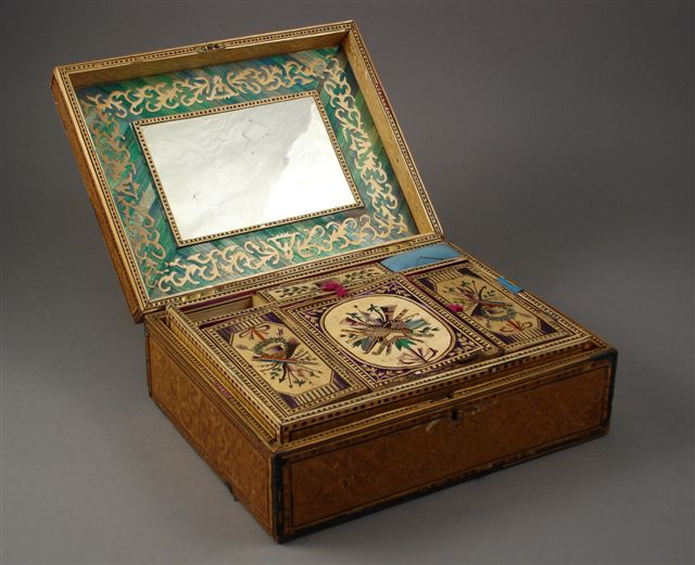 COFFRET à ouvrages en marqueterie de paille à décor de rinceaux et chevrons dans des encadrements à damier. Couvercle marqueté d'une riche corbeille de fleurs dans une réserve à pans. L'intérieur découvre un étage supérieur mobile à six cases fermées de vantaux marquetés double face de paille teintée : trophée d'instruments de musique et carquois de flèches, retenus par des noeuds de ruban. Étage inférieur masqué par un fond articulé marqueté sur les deux faces de rinceaux à décor d'un paysage à la cathédrale et d'oiseaux sur une fontaine dans des réserves à pans. Miroir à l'intérieur du couvercle.