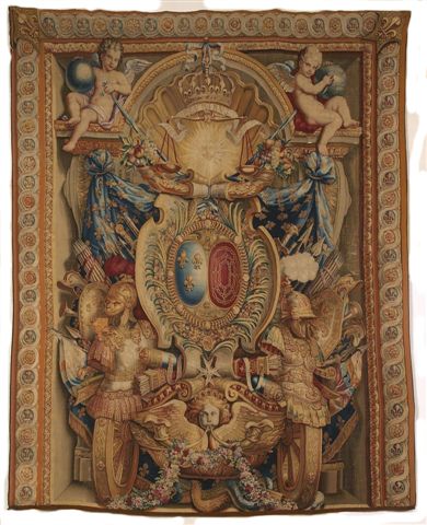 "Six portières de tapisserie de basse lisse de laine et soye manufacture des Gobelins, dessin de Lebrun, représentant au milieu les armes et la devise de Louis XIIII dans un cartouche porté sur un Char de triomphe, accompagné de trophées d'armes. La bordure est un guillochis qui enferme des fleurs de lys et des roses couleur de bronze. Chaque portière contient deux aunes et demy de cours, dont cinq, sur trois aunes de haut, et la six. sur deux aunes cinq six."