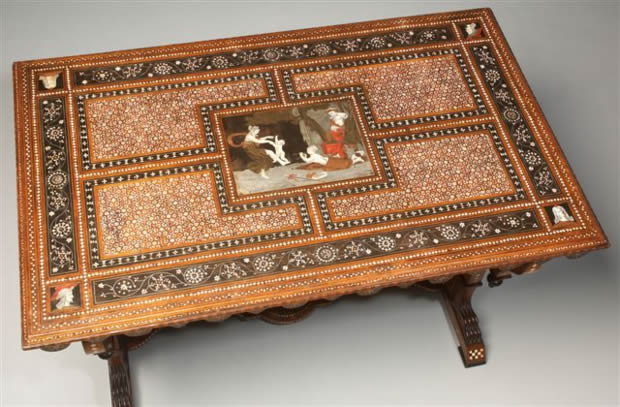 Le plateau est orné : dans les coins de quatre personnages - et en son centre d'une scène mythologique "La danse" - tableau d'étain, d'ivoire, de cuivres de couleurs, et de nacre.