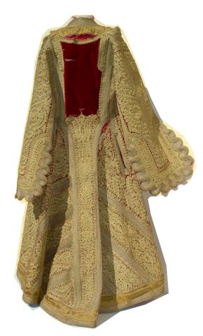 MANTEAU de CÉRÉMONIE, de mariage ou de cour en fils d'or à décor d'entrelacs et motifs floraux, avec empiècement de velours de soie cerise. (usures).