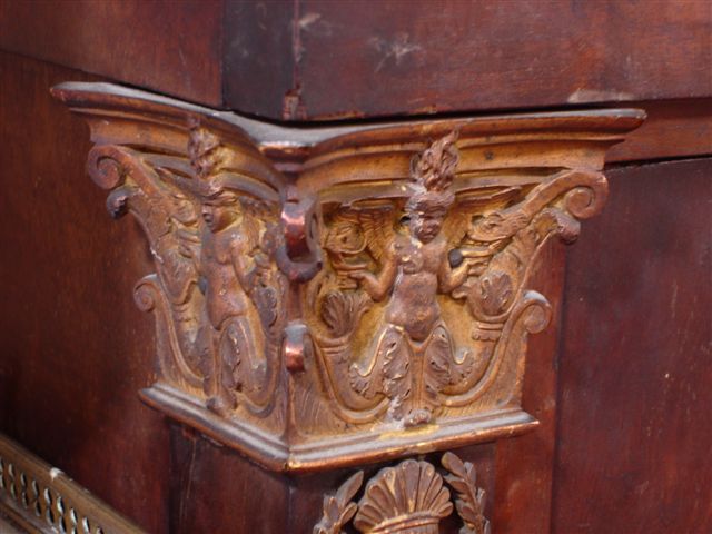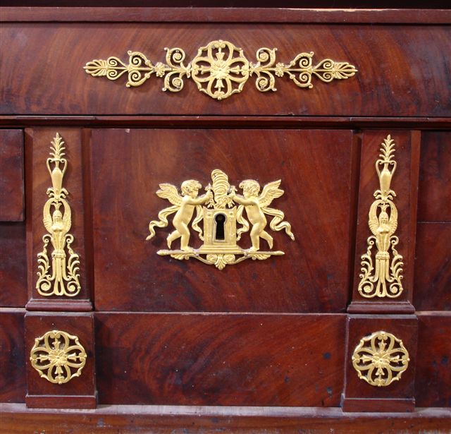 Riche ornementation de bronzes ciselés et dorés : cygnes se désaltérant dans une fontaine janiforme, chapiteaux à personnages mythologiques ailés offrant des coupes à des serpents, amours devant un autel, palmettes, sphinges affrontés. (Accidents au placage).