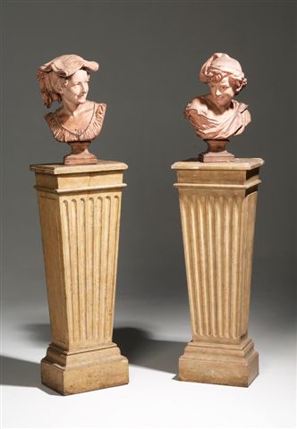 Paire de GAINES en bois rechampi mouluré. Le fût en pilastre à cannelures reposant sur une base cubique à doucine.