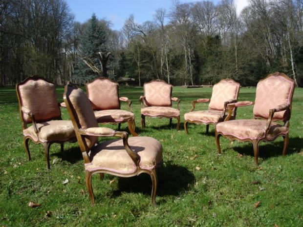 Suite de six FAUTEUILS à la reine en bois naturel mouluré et sculpté, à dossiers contournés. La traverse supérieure est ornée de cartouche feuillagé rocaille, comme la ceinture mouvementée. Les accotoirs galbés sont en retrait par rapport aux pieds galbés nervurés. Ces derniers sont terminés par un motif de feuille d'acanthe. (restaurations).