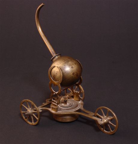 Boule de métal creuse, montée sur un chariot à trois roues, chauffée par un brûloir - produisant un jet continu de vapeur par un bec recourbé.