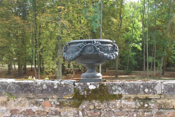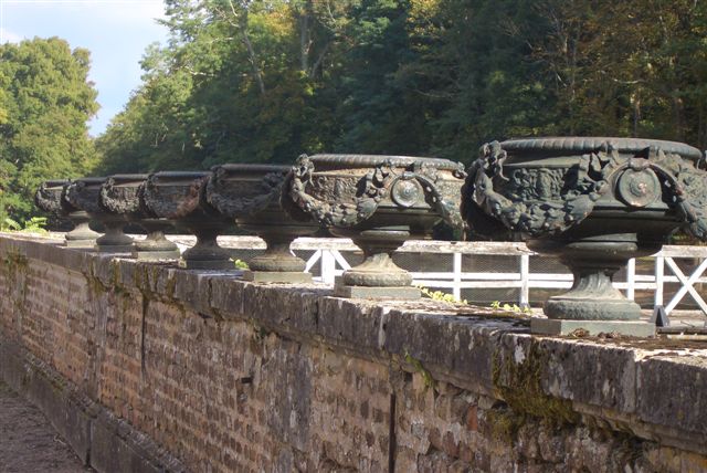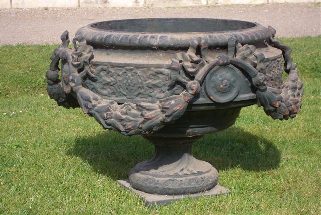 SUITE de sept VASES-URNES en fonte de fer, sur pied cannelé, et guirlandes fleuries sur tout le pourtour.