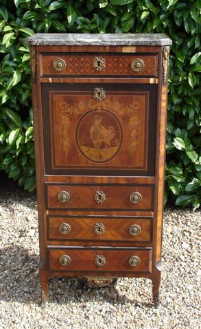 SECRÉTAIRE à abattant, à pans coupés, en bois de placage et marqueté d'un jeune chasseur relevant des pièges, dans un médaillon entouré d'une guirlande de fleurs. Décor de croisillon à fleurettes et marqueterie en aile de papillon.