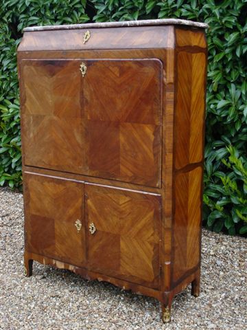 SECRÉTAIRE à ABATTANT en bois de placage et marqueterie en ailes de papillon sur la façade. La partie supérieure, à doucine, ouvre à un tiroir. L'abattant découvre un arrangement galbé de deux casiers surmontant une distribution de six tiroirs, de part et d'autre d'un autre casier. La partie inférieure ouvre à deux vantaux masquant des étagères et une boîte de rangement indépendante.