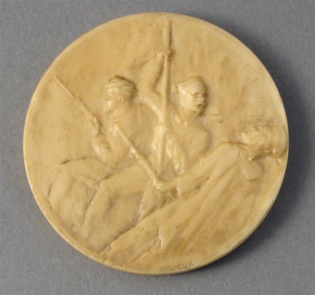 MÉDAILLE en ivoire à décor gravé de goumiers et d'un porte-drapeau.