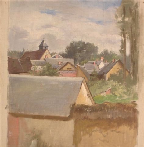 Adrien LAVIEILLE. Toits de village. Huile sur toile. 33 x 31,5 cm.