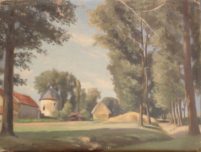 Adrien LAVIEILLE. Ferme fortifiée. Huile sur toile. Signée en bas à gauche. 31 x41 cm.