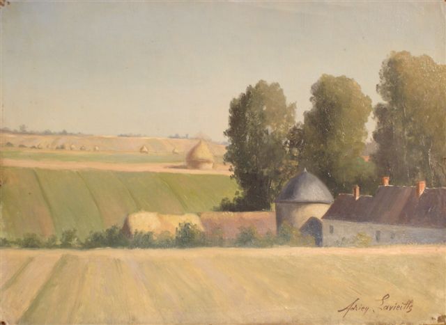 Adrien LAVIEILLE. Blés verts, meule et ferme fortifiée. Huile sur toile. Signée en bas à droite. 25 x 34 cm.