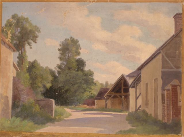 Adrien LAVIEILLE. Chemin de campagne longeant des habitations. Huile sur toile. 46 x 33 cm.