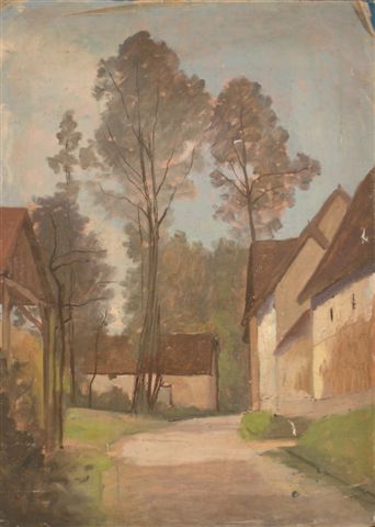 Adrien LAVIEILLE. Grands arbres dans un village. Huile sur toile. 49 x 36 cm.