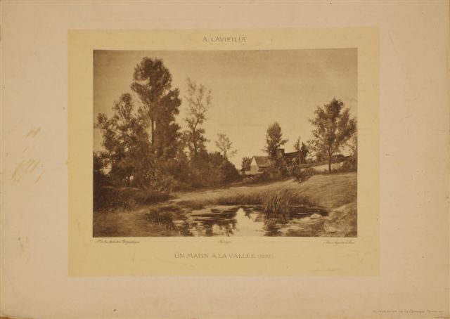 Lot comprenant un dessin signé et dédicacé LEPÈRE en bas à droite, trois reproductions du "Matin à La Vallée" tableau d'Adrien LAVIEILLE et une photo de trognes.