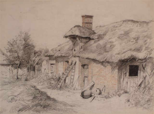 Marie-Adrien LAVIEILLE. Chaumière. Fusain et sanguine. Annoté au dos par Andrée LAVIEILLE "Mme Adrien LAVIEILLE". 21 x 28 cm.