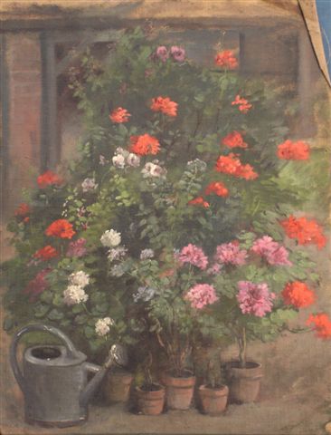 Marie-Adrien LAVIEILLE. Cour fleurie et arrosoir. Huile sur toile. 41 x 32 cm.
