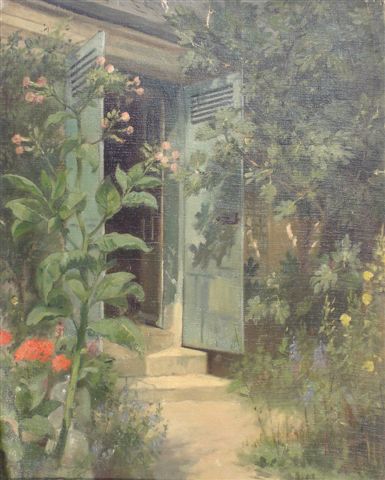 Marie-Adrien LAVIEILLE. Porte fenêtre fleurie. Huile sur toile. 41 x 33 cm.