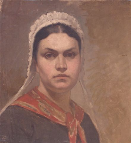 Marie-Adrien LAVIEILLE. Portrait de femme en coiffe. Huile sur toile. 50 x 48 cm. Au dos étiquette Marie Petit (Mme A. LAVIEILLE)
