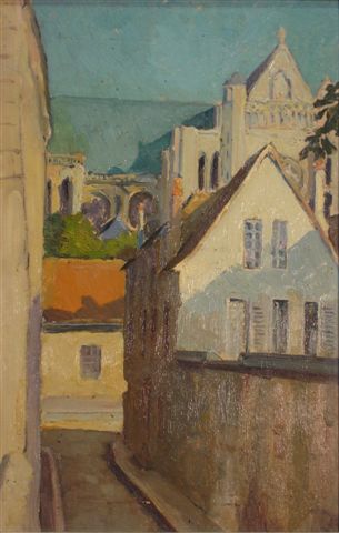 Andrée LAVIEILLE. "Rue du Palais de Justice Chartres". Huile sur carton. Signée, légendée et datée au dos 1919-1924. 41 x 27 cm.