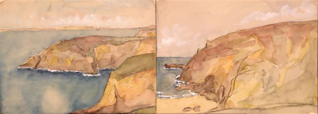 Michel TUFFRAU. Vues de la côte bretonne, dans la région de la pointe du Raz et de la pointe du Van (Finistère). Paire d'aquarelles gouachées. 21 x 27 cm.