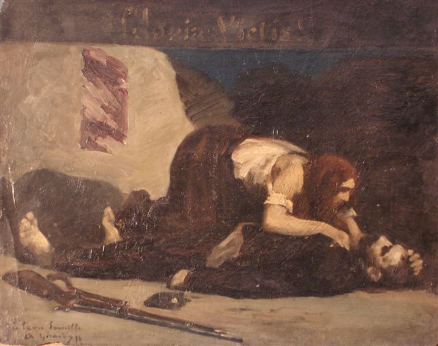 Auguste GIRARDIN, Gloria Victis. Huile sur toile. Signée en bas à gauche et dédicacée "à l'ami Lavieille". 32 x 41 cm.