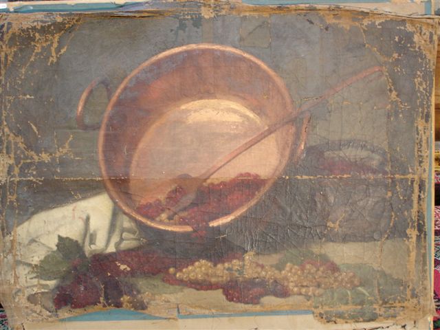 Joseph BAIL (1862-1921) ? Confiture de groseille. Huile sur toile. 55 x 77 cm. Accidents, manques, déchirures.