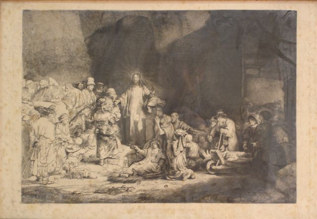 D'après REMBRANDT. "Jésus-Christ guérissant les malades". Eau forte. Imprimée par A. DURAND à Paris. 31 x 46 cm.