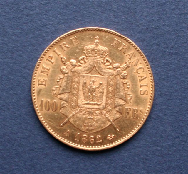 100 francs or, tête laurée, 1862, Paris.F. 551, Fr. 580....
