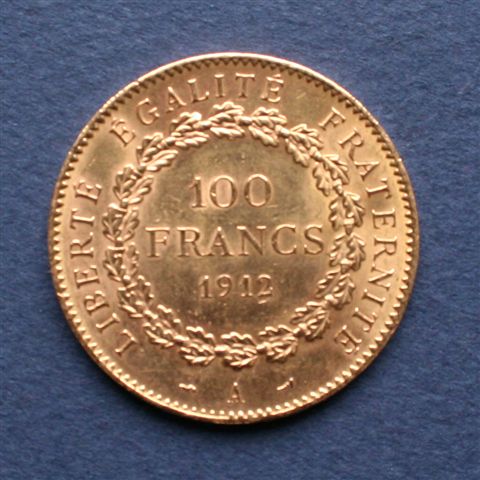 TROISIÈME RÉPUBLIQUE (1870-1940), 100 francs or, type Génie, 1912, Paris.