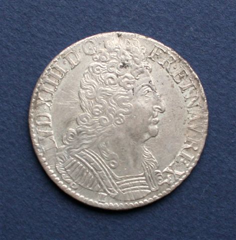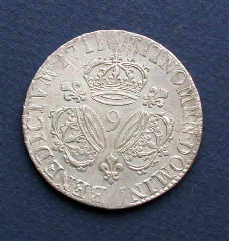 LOUIS XIV, écu aux trois couronnes, ar., 1711, Rennes, 30,56 g, stries au revers.
