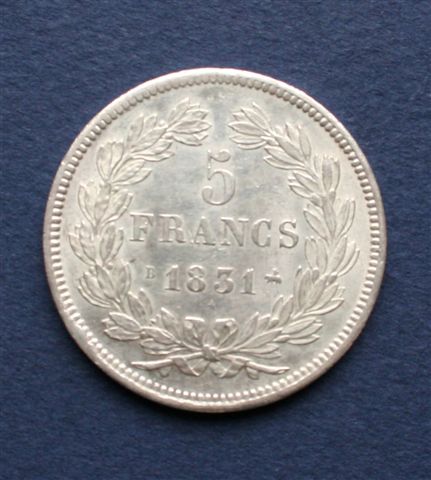 LOUIS-PHILIPPE 1er (1830-1848) : 5 Francs, 1er type Domard, tranche en relief, ar., 1831, Rouen, 25,21 g.