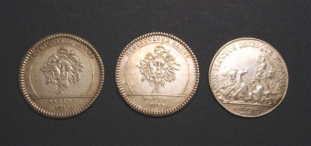 LOT : Marine-Galères, 3 jetons, Fe. 1355 (2), 1451(cuivre, non répertorié en ar.). TTB.