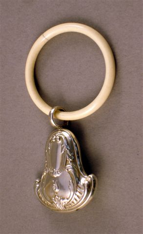 HOCHET de forme chantournée, orné d'agrafes et de feuilles d'acanthe. Argent. Anneau. Poids brut 10 g.