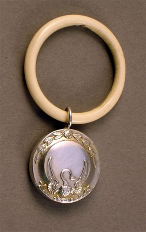 HOCHET de forme ronde, orné d'une guirlande de feuilles de lauriers et d'un cygne. Argent. Anneau. Poids brut 12 g.