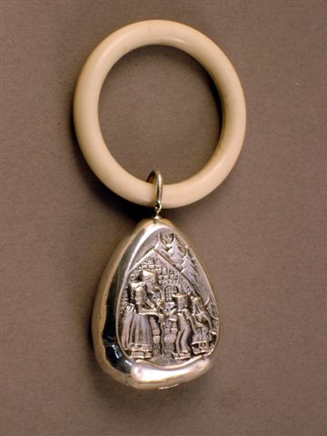 HOCHET en forme de pendeloque figurant une scène de montagne. Argenté. Anneau.