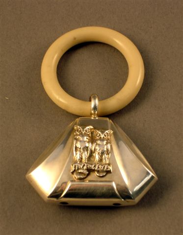 HOCHET de forme trapézoïdale, orné de deux chouettes. Argenté. Anneau. Poids brut 20 g.