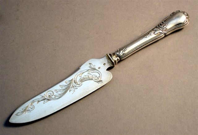 COUTEAU à GÂTEAU en argent. Manche en argent fourré orné d'un double filet et de végétaux stylisés. Lame en métal gravée d'agrafes et d'enroulements.