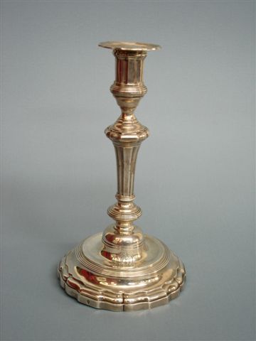BOUGEOIR en argent posant sur une base ronde et mouvementée gravée de filets. Le fût et le binet à pans. L'ombilic monogrammé postérieurement. Avec sa bobèche. (réparations).
