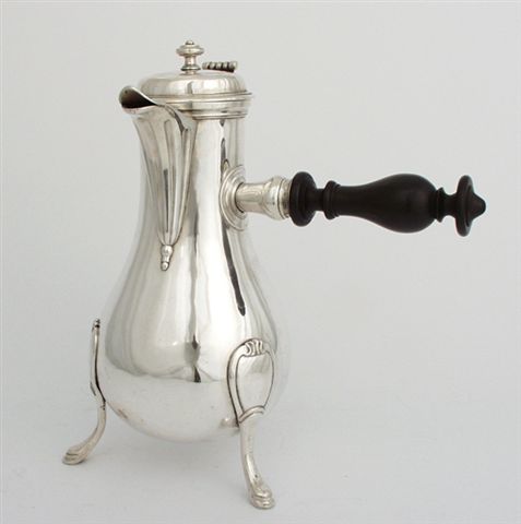 CAFETIÈRE tripode en argent, sur pieds patins en applique à cartouche. Bec verseur "canard" côtelé, prise de couvercle en bouton mouluré, manche latéral en bois.
