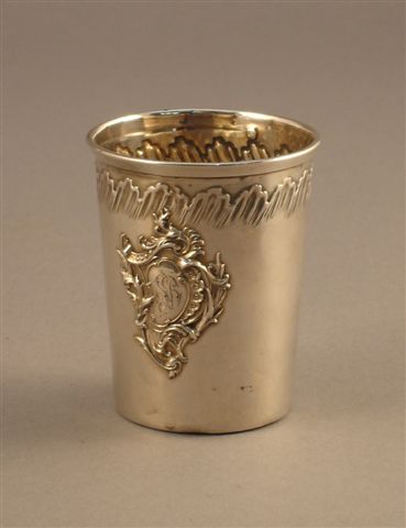 TIMBALE en argent. Frise de barbe en repoussé sous le col, cartouche rocaille monogrammé "SB" sur le flanc. Poinçon Minerve.
