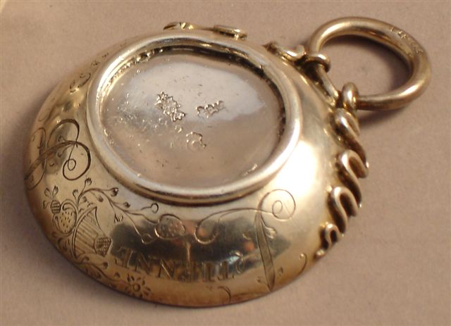 TASTE-VIN en argent. Décor patronymique gravé : Etienne Bortron ? orné de fleurettes et fraisier. Anse de serpent. Poinçon de maître orfèvre Jacques RIBREAU, reçu maître à Thouars (Deux-sèvres) en 1735, toujours en activité en 1775. Poinçon de Maison Commune pour Parthenay en 1775. Poinçon de la juridiction de Poitiers.