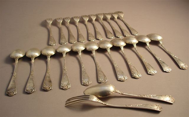 Onze COUVERTS en argent et une CUILLÈRE en argent. Ornés de branchages fleuris et d'agrafes de style rocaille. Poinçon Minerve.