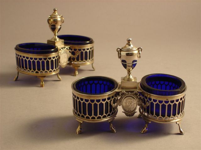PAIRE DE DOUBLE SALIÈRES en argent et verres bleus. Les deux récipients en verre bleu sont réunis par une monture ajourée constituée au centre d'une tablette, ornée de deux médaillons enrubannés dont un monogrammé DR, supportant un pot couvert à deux anses en anneaux mobiles reposant sur un socle carré. L'ensemble repose sur huit pieds en sabot de chèvre.