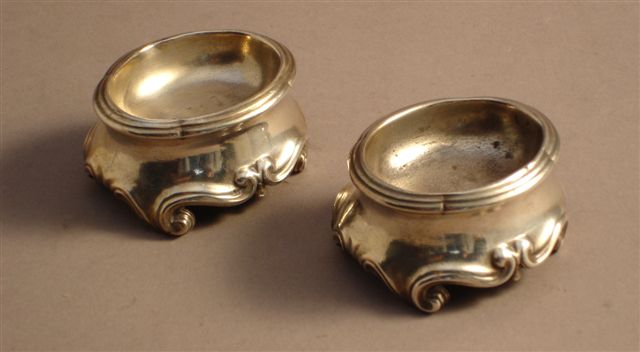 PAIRE DE SALERONS de forme ovale en Pompone. Piètement plein terminé en enroulements et agrafes affrontées.