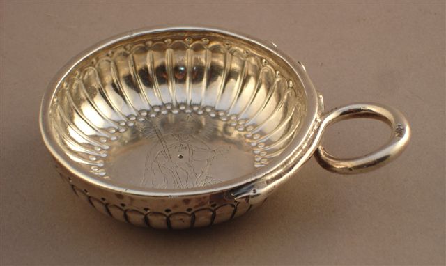 TASTE-VIN en argent. Intérieur gravé de la figure de Saint Nicolas entouré de jeunes enfants, panse godronnée, gravée du patronyme "Nicolas Matras". Prise en serpent.